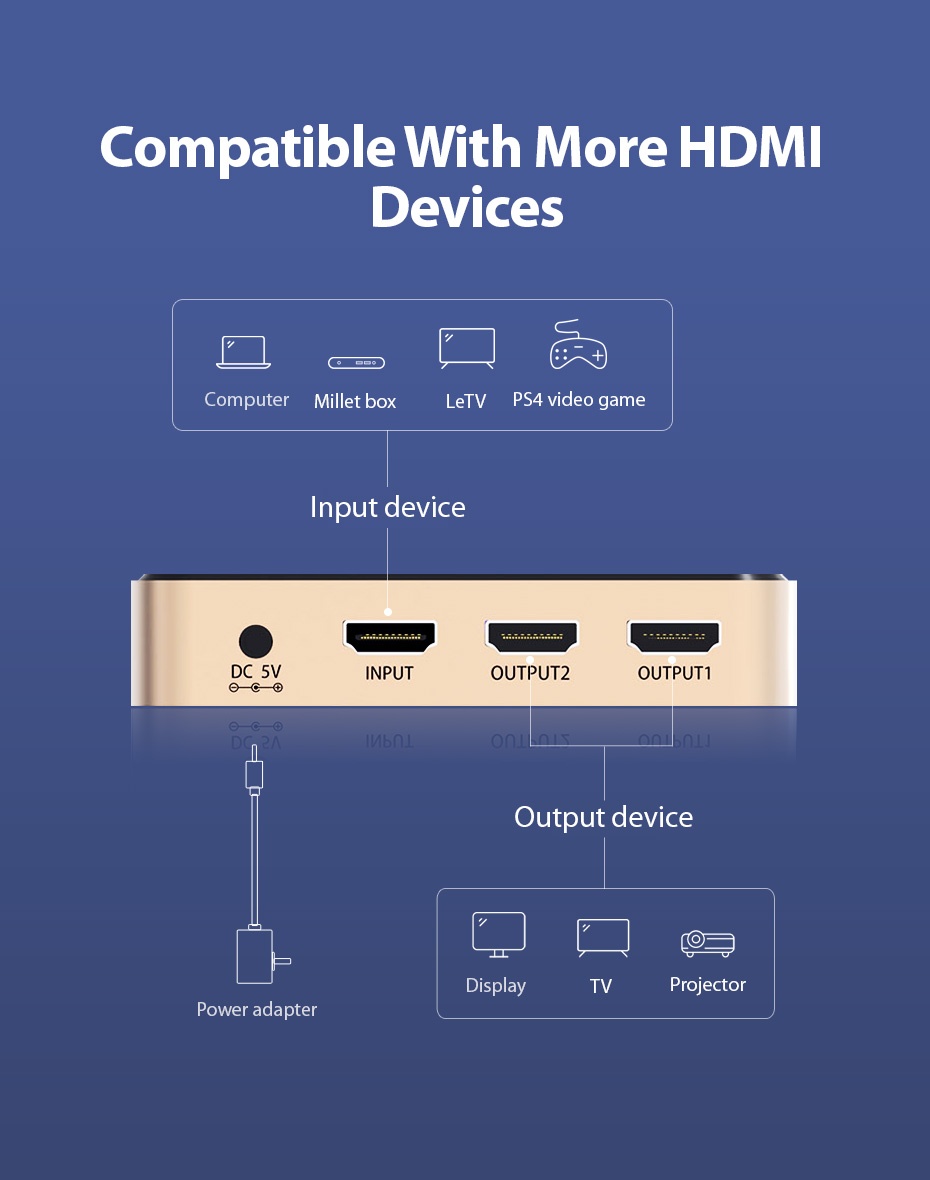 The HDMI splitter works with all HDMI-enabled devices, including: